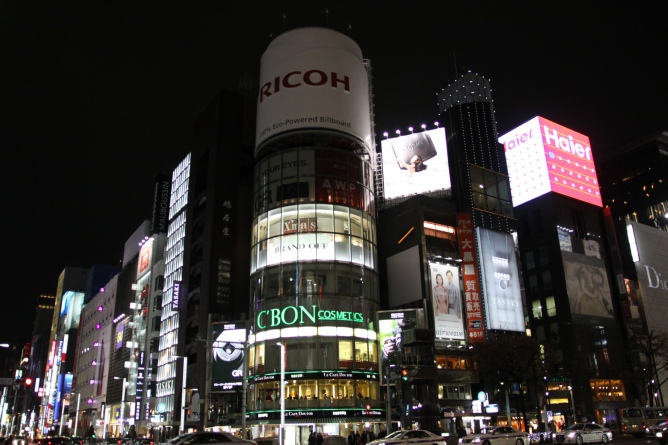 被雨水清洗過的銀座非常乾淨,所有的霓虹燈都非常清澈閃亮,東京的營業時間通常只到晚上9點,如果不是很多店家都打烊了,還真看不出來已經晚上9點半了說~~