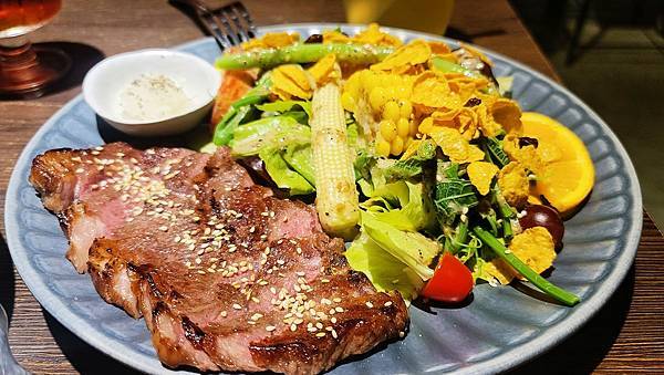 <炙燒小牛肩沙拉>牛排香嫩好吃,恰到好處的熟度,鮮紅的肉色不停的勾引著我們的視覺與味蕾,不得不說,這已經是超出我們想像的美味,搭配清爽的沙拉與水果,在舌尖譜出一段美妙的樂章